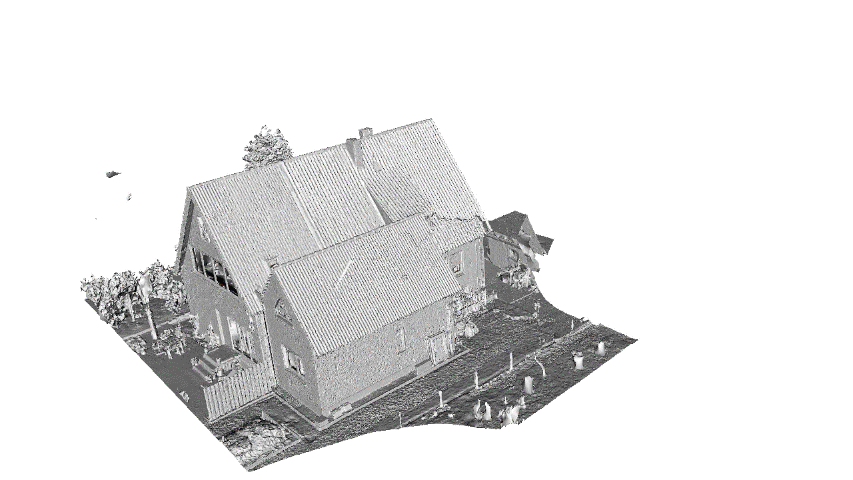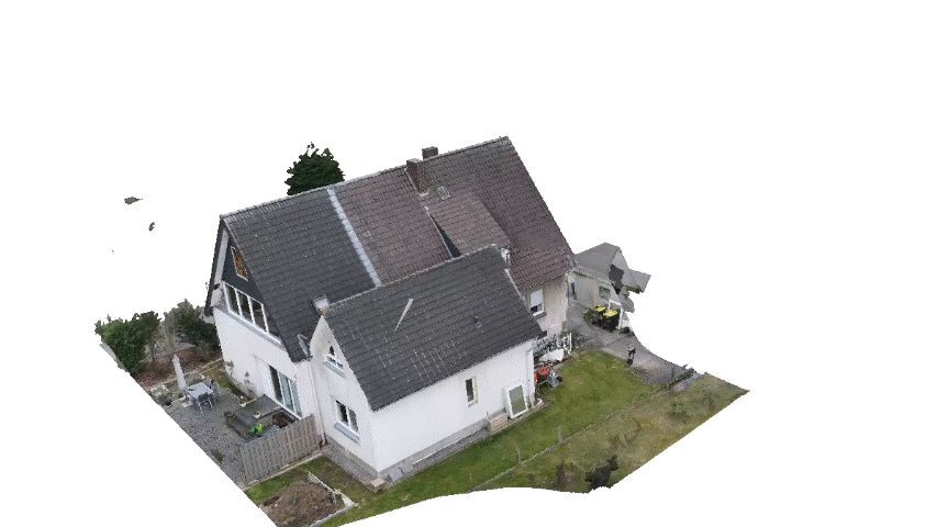 Das Ergebnis ist eine sparse point cloud, also eine grobe Punktwolke, die bereits die Grundform des Gebäudes erkennen lässt. Sie dient als Basis für alle weiteren Schritte.