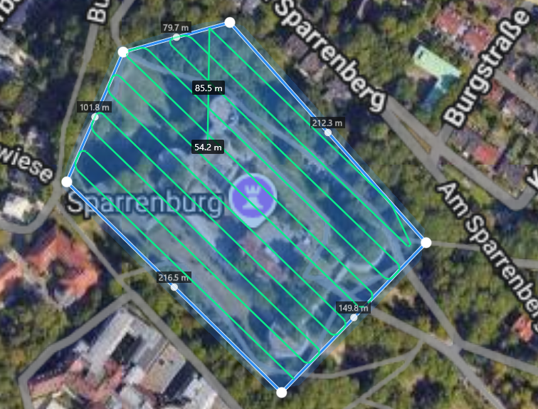 Ich fliege die Drohne in einer gleichmäßigen Höhe über das Gebäude und nehme Fotos aus der Draufsicht auf. Diese senkrechten Aufnahmen sind besonders wichtig für die spätere Orthoprojektion, da sie eine verzerrungsfreie Darstellung ermöglichen.